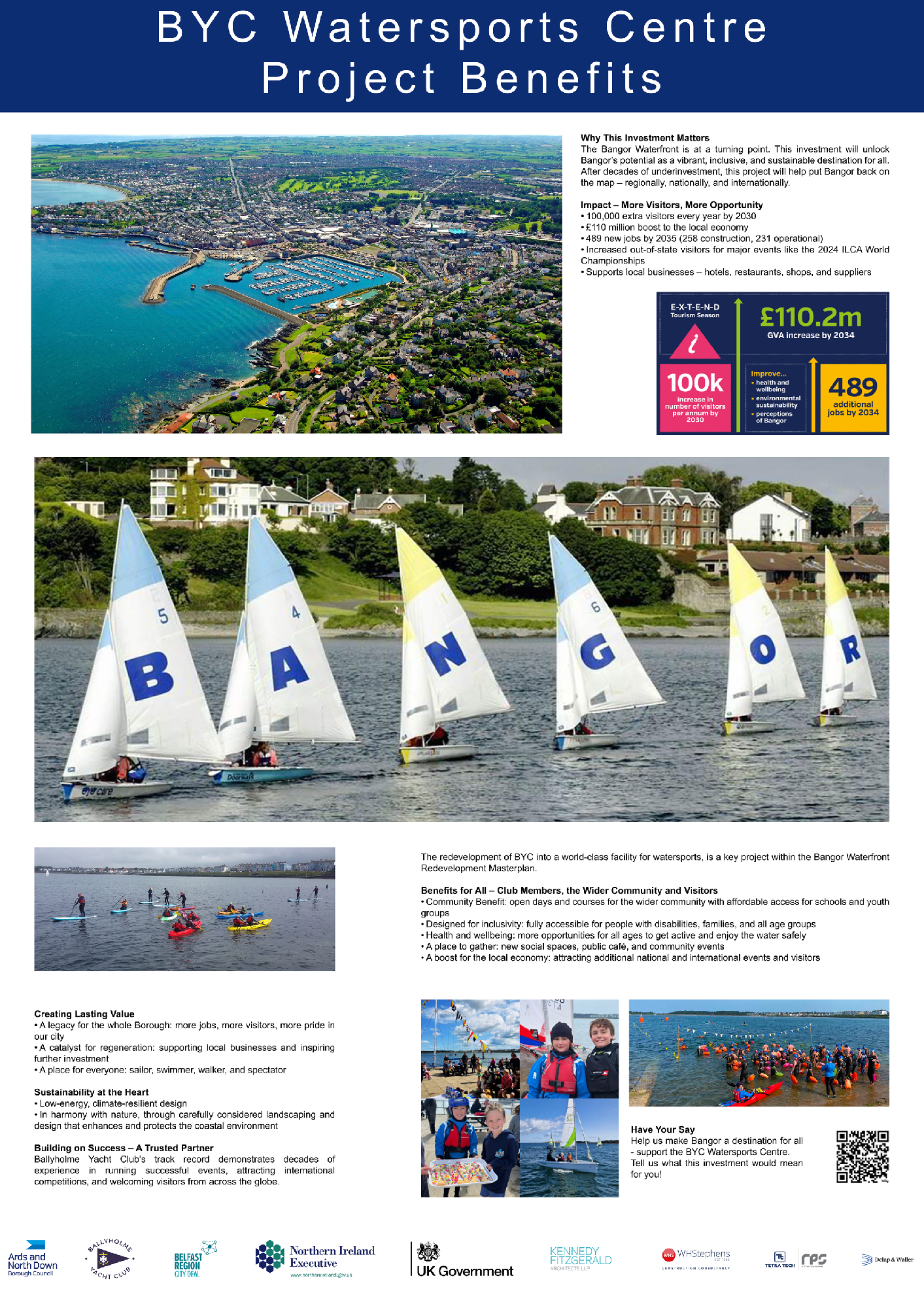 The redevelopment will enhance Ballyholme Yacht Club's facilities, creating a state-of-the-art destination for water sports for the whole community, and for Northern Ireland. The aspiration is to widen public participation across all ages and abilities. This aligns with Council's objectives under the Belfast Region City Deal to increase community participation in water sports, attract more visitors to the Borough through major events such as this summer's highly successful European Youth Championships, and provide jobs.